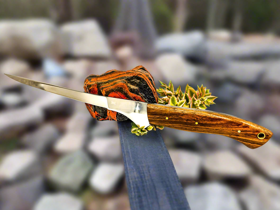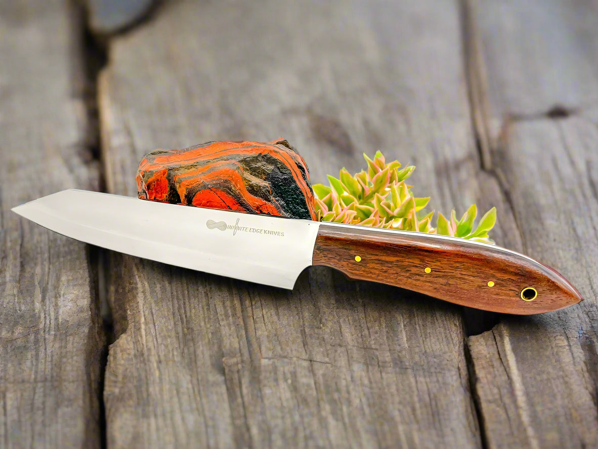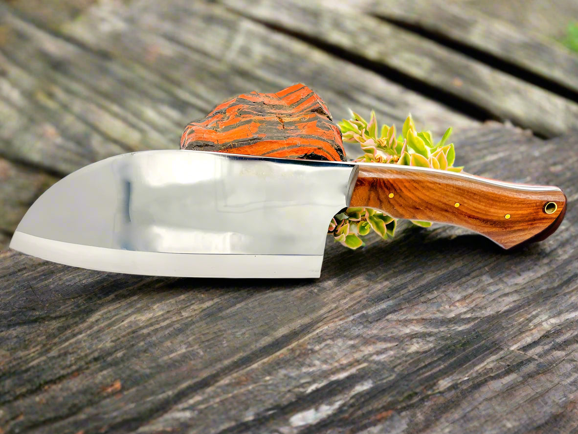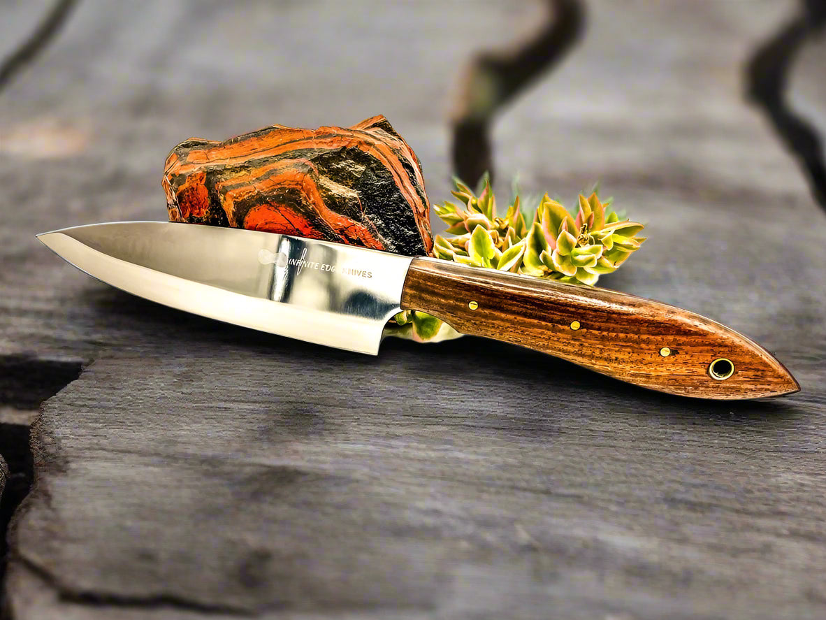 Our hand crafted knives are made with either stainless steel known as Japanese 440c and is a well-known type of Japanese stainless steel used for making knives. It's popular because it resists rust well, stays sharp for a long time, and cuts effectively.It has a rockwell hardness of 60-61 after heat treatment.
