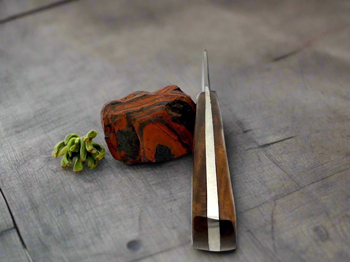 Our hand crafted knives are made with either stainless steel known as Japanese 440c and is a well-known type of Japanese stainless steel used for making knives. It's popular because it resists rust well, stays sharp for a long time, and cuts effectively.It has a rockwell hardness of 60-61 after heat treatment.