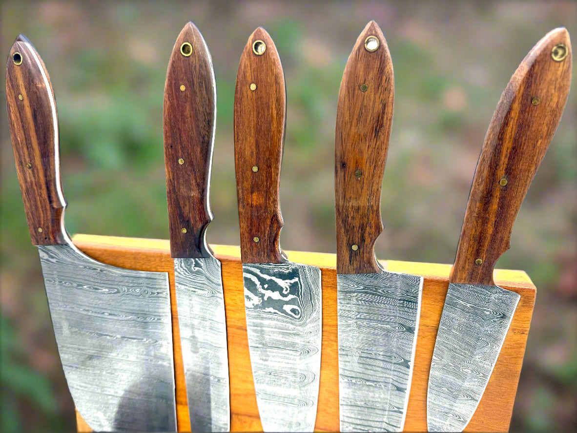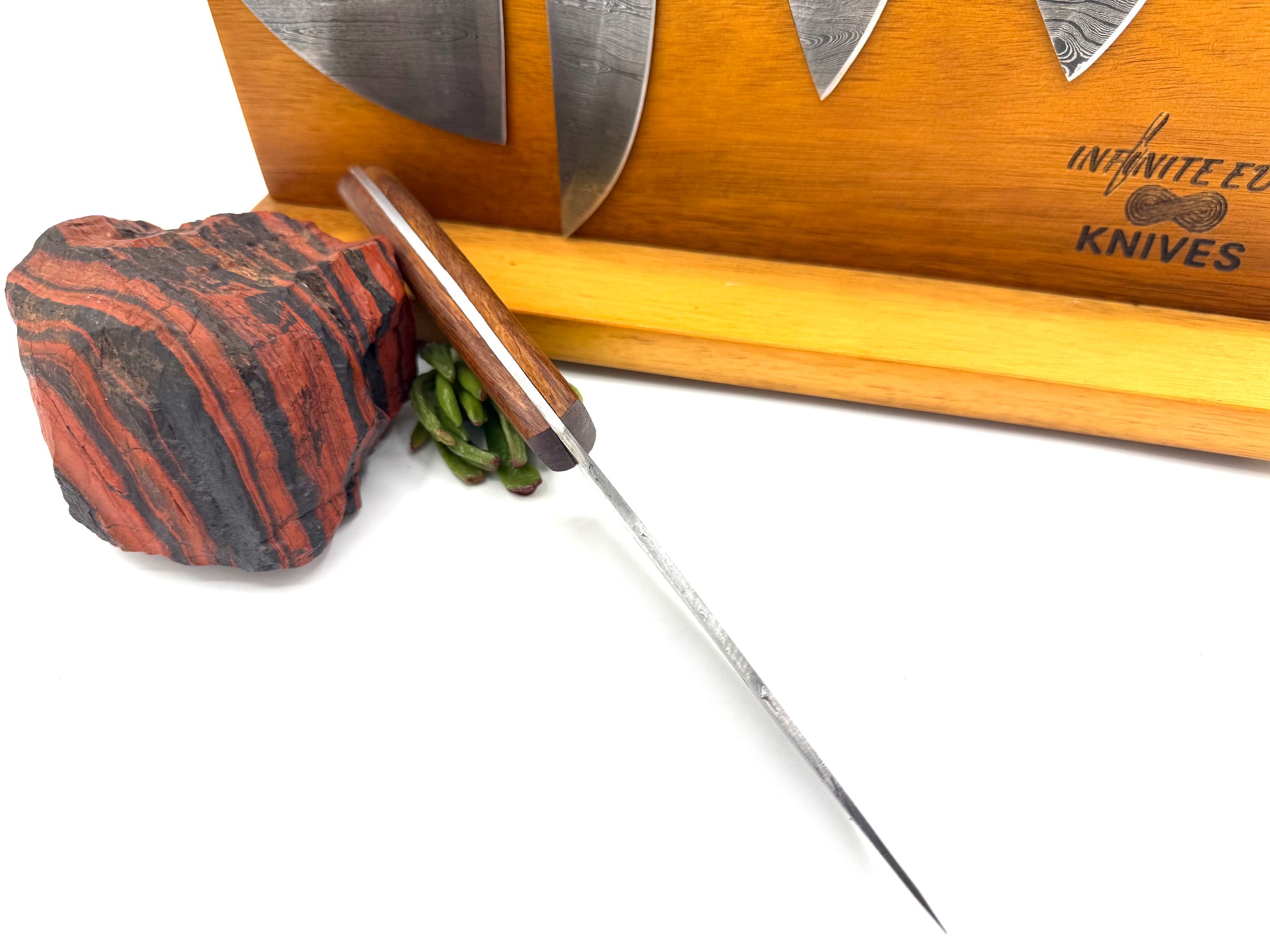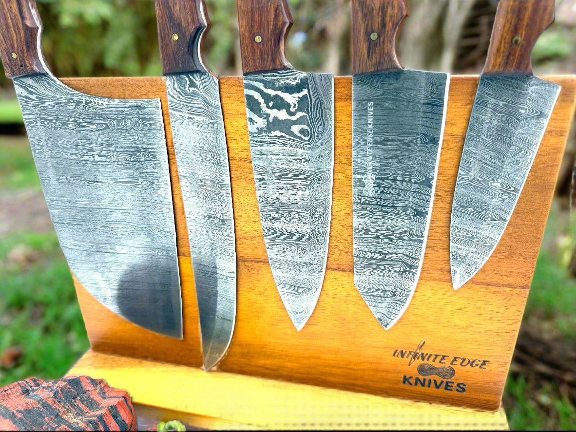 Take your BBQ pit skills to the next level with the " PIT MASTER" knife set, Not only do these knives look like a work of art, but they perform like one as well. This set can be used for camping, BBQ, or in the kitchen and is a well rounded set to get the job done with ease. Hand forged and crafted from high carbon Damascus steel it makes for the perfect work horse. It is a well weighted set and is ready to slice and dice whatever you put in front of it. The last set of knives you will ever need.